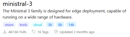 When you first install Ollama and connect to it through Transana for the first time, you will not have any models installed. There are many different models to choose from within Ollama, and the task of figuring out what model(s) to download and use may seem daunting for beginners. We recommend you read Using AI as a way of familiarizing yourself with this topic. (We tested about 140 models and determined which models work well for text analyses and image analyses. The results are included there.) You may also want to visit the Ollama Models page. A sample model listing from that page for the “ministral-3” model is shown here.