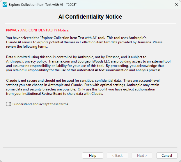 The first page of Transana’s tool for AI exploration of data lays out the tool’s terms. It is the researcher’s responsibility to evaluate whether it is appropriate to use this tool given any confidentiality or privacy issues that may apply to your data. If you can accept the terms of use, check the box agreeing to those terms. If you cannot agree to these terms, do not use external AI to explore your data.