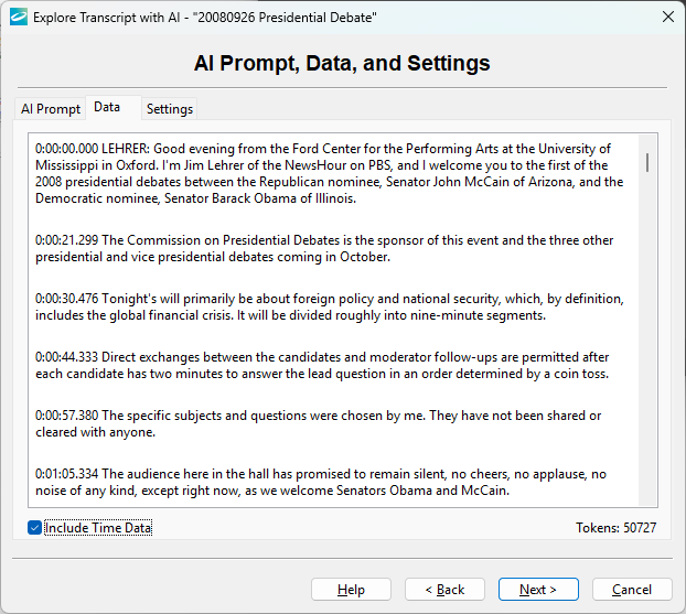 The next page handles preparing for AI exploration. There are three tabs on this page. When all three tabs are set, press the Next button to process the AI prompt defined on the AI Prompt tab with the data defined on the Data tab.