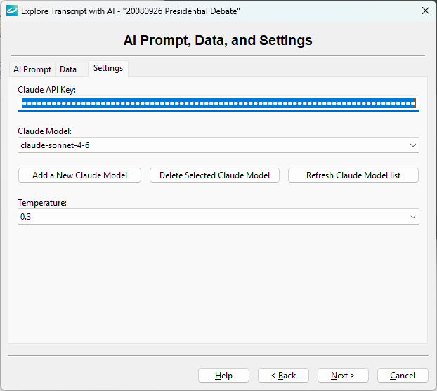 The Settings tab allows you to enter your Claude API Key, which connects Transana to your Anthropic Claude account so that Anthropic can manage billing for your queries in Claude. Please note that a Claude API Key is NOT the same thing as a Claude user account.