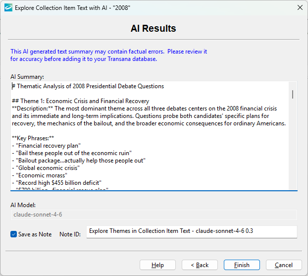 Because of this, Transana presents AI results for review and possible editing and correction. If the AI result is useful or interesting, Transana can save it as a Note attached to the data item selected originally for AI Exploration.