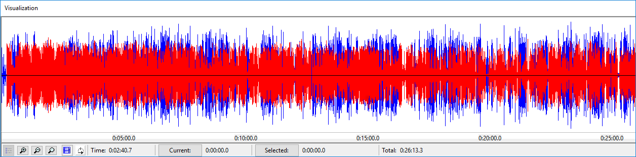 The Visualization Window displays visual representations of the data loaded in the Transana interface in the form of a waveform diagram representing the audio track of media data, of a bar chart showing coding that has been applied to text and media files during the analytic process, or a hybrid visualization that includes both a waveform and a bar chart.